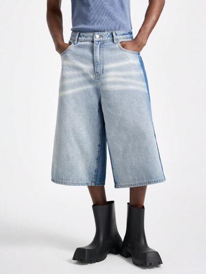 NEON BLANC 男士街头时尚宽松阔腿七分牛仔裤 - 藍色 - 查看 4