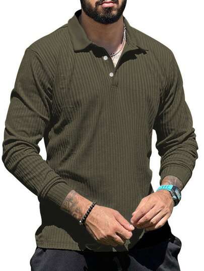 NITAGUT 男士休閒長袖 Polo 衫 - 軍綠色 - 查看 1
