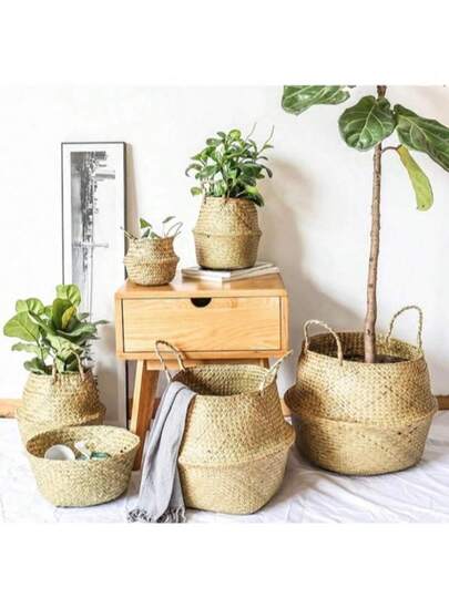 天然海藻手工编织篮 | 可折叠,适合用作收纳篮/洗衣篮、洗碗篮和花盆(适合种植绿色植物),简约风格,适合家居、花园、民宿客厅、网红装饰和多功能收纳。