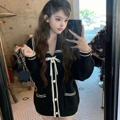 海军风超大领结针织羊毛开衫 - 黑色 - 查看 1