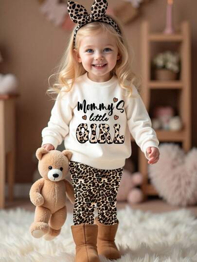 SHEIN 2 件奶油米色复古可爱豹纹“Mama's Little Girl”字母图案圆领长袖运动衫和紧身裤套装,适合年轻女孩的秋冬装 - 彩色 - 查看 1
