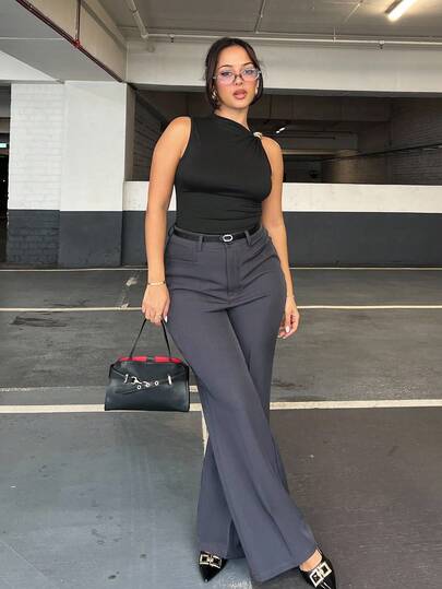 NegzBox 女士休闲商务简约口袋设计喇叭形梭织长裤 - 深灰色 - 查看 1