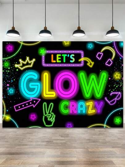 霓虹派对装饰背景,让我们在黑暗中发光横幅摄影背景,生日睡衣涂鸦泼墨黑光照相亭 - 派对装饰背景 - 彩色 - 查看 1