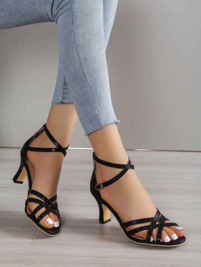 新款細帶時尚女式高跟涼鞋,舒適厚跟防滑黑&金細帶女式涼鞋 - 黑色 - 查看 1