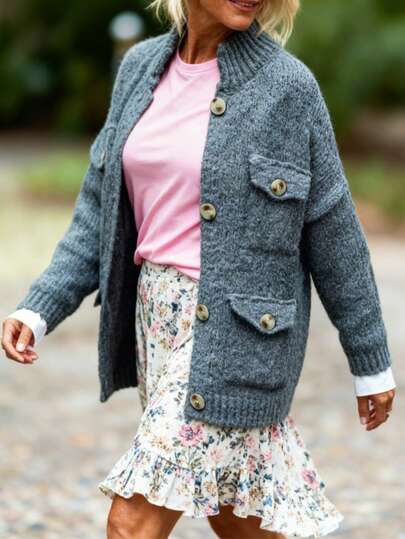 新品女式休闲纯色纽扣针织开衫,秋冬款 - 霧霾藍 - 查看 1