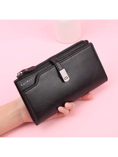 新品女士长款钱包带金属扣多功能卡包三折卡包时尚拉链零钱包女士商务休闲钱包钱夹 - 黑色 - 查看 1