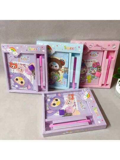 新款卡通日记本带笔,儿童创意惊喜文具,学生减压笔记本带锁 - 彩色 - 查看 1
