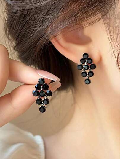 新款优雅奢华黑水晶耳钉,时尚小葡萄闪亮耳环,高端大气的耳环 - 黑色 - 查看 1