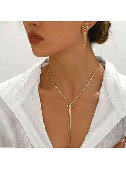 新款欧美热销单钻蝴蝶结项链,时尚奢华高端不锈钢单钻蝴蝶结耳环,女士百搭日常配饰 - 金色 - 查看 6