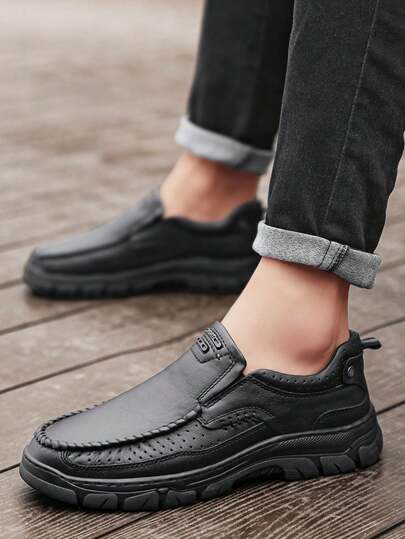 全新时尚男士休闲鞋真皮男鞋手工一脚蹬驾车鞋平底乐福鞋莫卡辛鞋步行鞋 - 黑色 - 查看 1