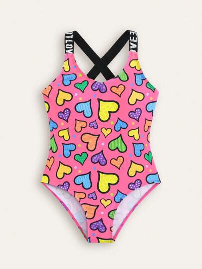 全新时尚彩色心形印花连体泳衣,适合女孩 - 淺粉色 - 查看 5