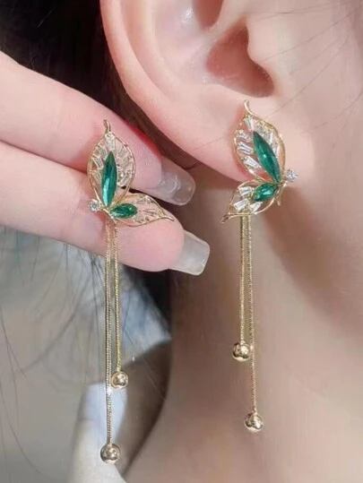 新趨勢綠色蝴蝶長流蘇韓語風格優雅簡單百搭耳環 - 綠色 - 查看 1