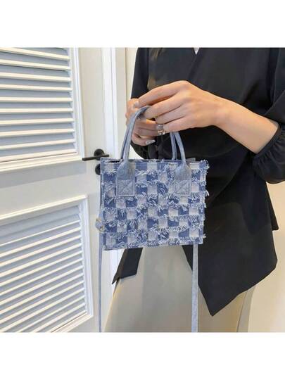 新款春夏拼色格子流苏手提包,休闲女士单肩斜挎托特包,百搭 - 彩色 - 查看 1