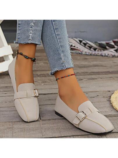 新款春夏女士休闲方头平底乐福鞋,腰带扣装饰,舒适一脚蹬大码鞋 - 米色 - 查看 1