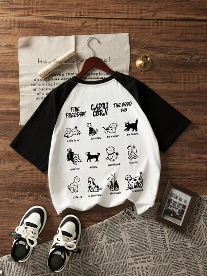 全新夏季女式休闲宽松可爱猫狗印花拼布 T 恤 - 白色 - 查看 9