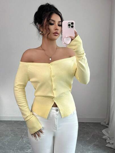 Elenzga 新款女V领开衫欧美风百搭简约时尚针织上衣 - 黃色 - 查看 1