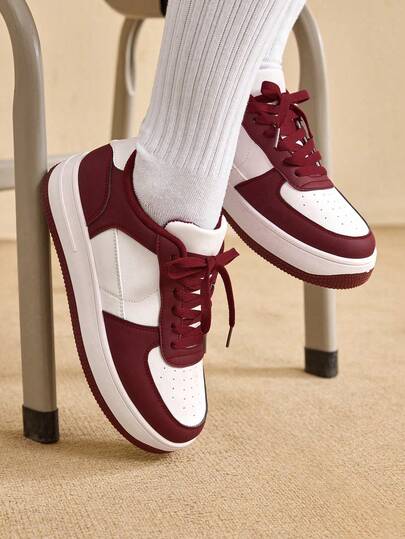 女童新款白色低帮运动鞋,青少年休闲运动滑板鞋,时尚系带透气防滑软底鞋 - 酒紅色 - 查看 1