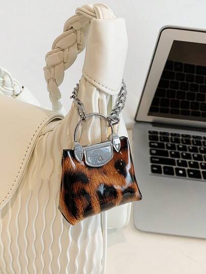 全新女式 PU 皮革铂金迷你吊坠包时尚百搭钥匙扣吊坠包迷你小袋吊坠链迷你手提包钥匙扣小袋吊坠背包装饰猎豹印花豹纹 - 棕色 - 查看 1