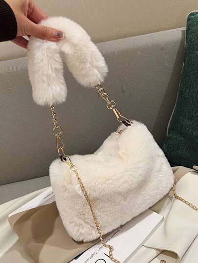 新款女士INS风小方包斜挎包,时尚链条毛绒包,秋冬韩版小方包 - 白色 - 查看 1