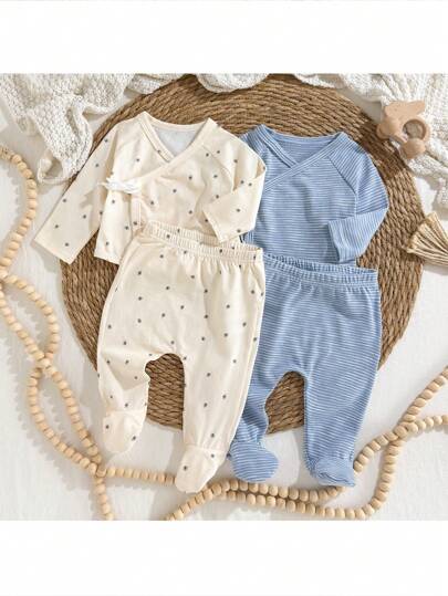 Loomiva 新生儿 4 件套:小碎花柔软针织圆领长袖套头衫和松紧腰裤 - 彩色 - 查看 1