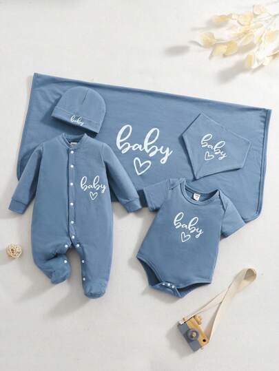 新生儿 5 件套春夏针织连体衣、口水围兜、毛毯、帽子、英文字母休闲服装家具 - 藍色 - 查看 1