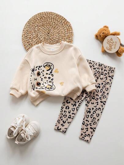 新生女婴可爱休闲卡通图案保暖长袖运动衫和裤子套装 - 卡其色 - 查看 1