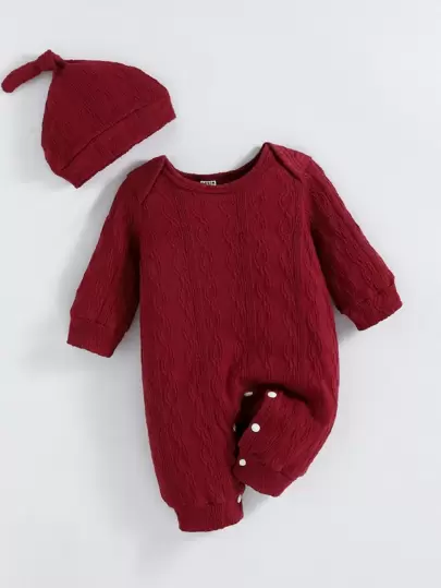 嬰兒嬰兒素色紋理質感連身褲和帽 - 酒紅色 - 查看 1