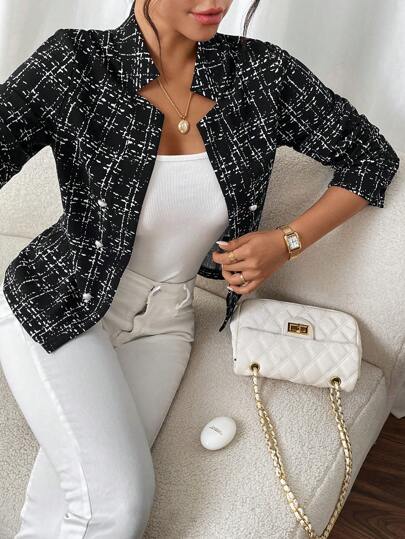 SHEIN Frenchy 女士双排扣缺口领休闲时尚常规夹克 - 黑與白 - 查看 1