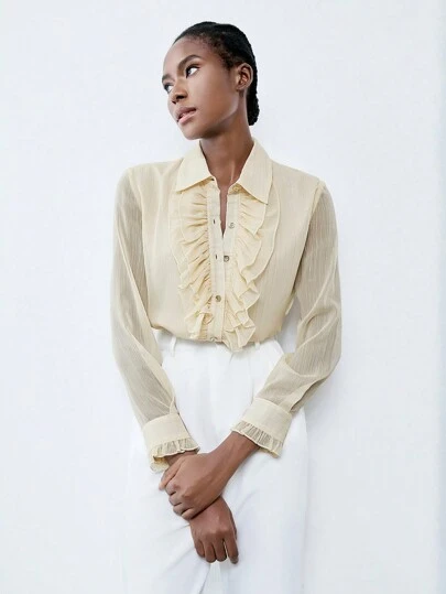 Chiquease 金色金属条纹纯色雪纺面料开衫,长袖,荷叶边领和饰边,宽松版型,优雅女士工作休闲衬衫,春秋女士衬衫 - 杏色 - 查看 1
