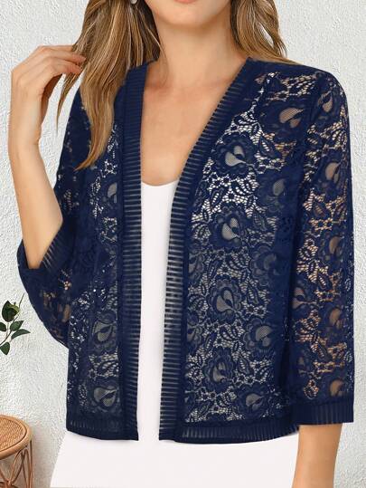 山茶花蕾絲拼接肋紋開衫,配有3/4袖 - 藏蓝色 - 查看 1