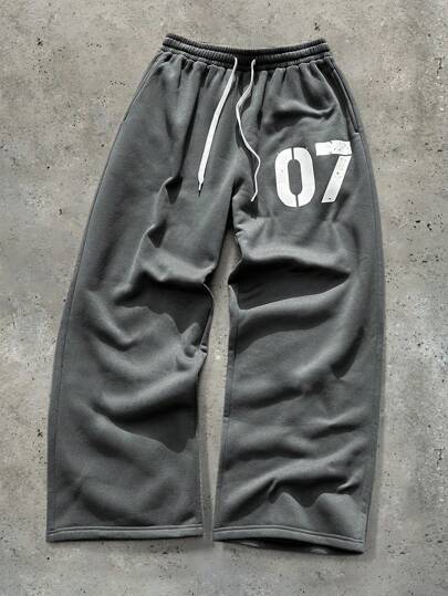 男士休闲街头嘻哈松紧腰数字07印花运动裤,秋冬 - 深灰色 - 查看 1