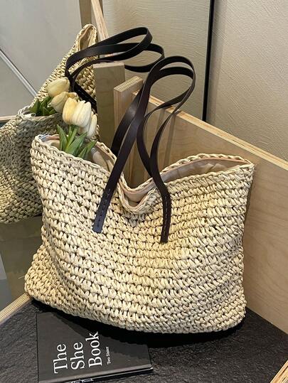极简主义超大尺寸,适合度假旅行、夏季、度假的完美选择、假日、草编钱包、草编沙滩包、沙滩必需品、沙滩必需品、沙滩用品和夏季必需品、最适合海滩氛围的女士包、夏季度假包 - 米色 - 查看 6