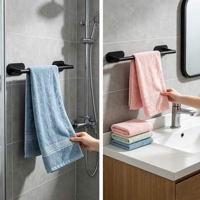无需钻孔的毛巾杆,适合租房者使用的浴室毛巾架,黑色简约壁挂式挂架,可重复使用,不损坏墙面。