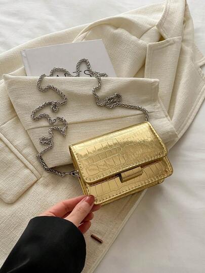 秋冬季新款时尚迷你方包,五金蝴蝶结装饰,翻盖开口,金属双链,小容量轻便简约斜挎包。适合女性日常生活休闲学生使用的零钱包 - 金色 - 查看 6