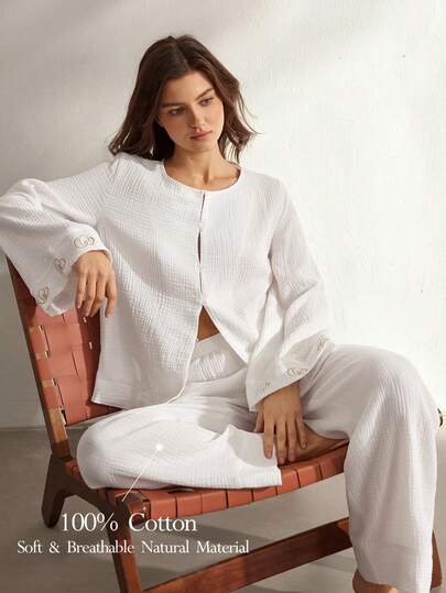 Ocili 100%纯棉舒适波西米亚刺绣贝壳纽扣长袖休闲女式睡衣套装 - 白色 - 查看 1