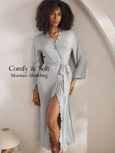 Ocili 休闲简约荷叶边长款系腰睡袍,女士家居服,时尚秋日睡袍,舒适长袖睡袍 - 灰色 - 查看 1
