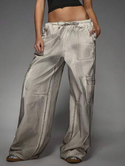 MISSGUIDED 高腰阔腿工装牛仔裤做旧洗水牛仔裤实用工作服街头服饰节日 Y2K 时尚秋冬宽松抽绳 - 卡其色 - 查看 8