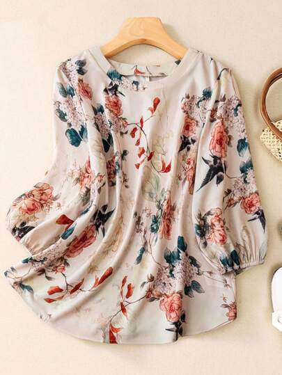 Linhara 复古花卉印花圆领长袖衬衫,大码女式 - 彩色 - 查看 1