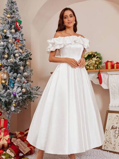 一字肩荷葉邊婚紗洋裝 - 白色 - 查看 1
