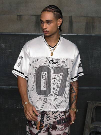 AXEPEAK 街头风格 V 领短袖数码印花宽松男式 T 恤 - 白色 - 查看 5