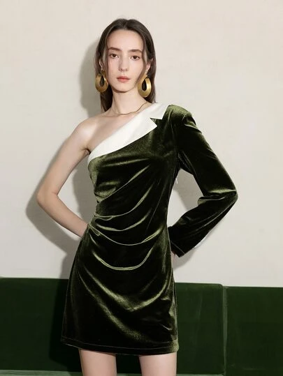 單肩拼接面絲絨連衣裙 - 軍綠色 - 查看 1