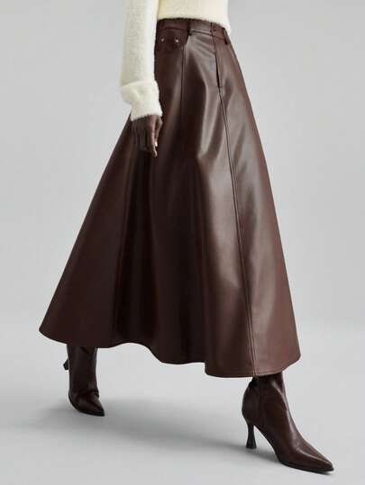 Ontre 2026春夏新款女士宽松A字PU皮裙,都市通勤商务优雅风 - 棕色 - 查看 1