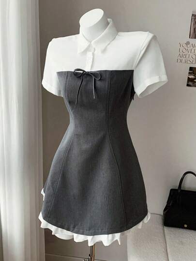 Comfortcana 女士撞色短袖蝴蝶结装饰迷你衬衫裙 - 深灰色 - 查看 1