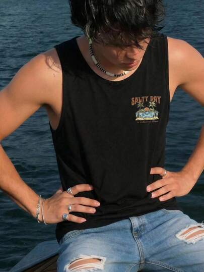 Open Phase 男士轻薄夏季度假棕榈树字母印花休闲背心,春夏皆宜 - 黑色 - 查看 1