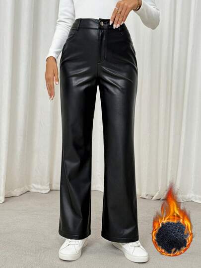 SHEIN LUNE 大码冬季纯色前扣口袋简约设计休闲羊毛保暖皮裤,日常穿着 - 黑色 - 查看 1