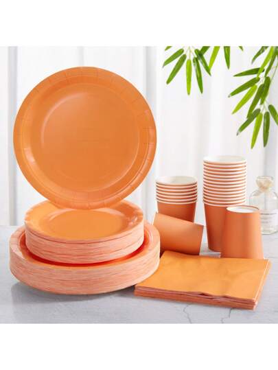 橙色一次性盘子和餐巾派对用品,适合 24 位客人,生日、婚礼、派对、家庭野餐的一次性纸盘和餐巾 - 彩色 - 查看 1