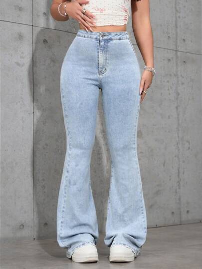 SHEIN Privé 女士高腰喇叭休闲百搭牛仔裤 - 淺色水洗藍 - 查看 1