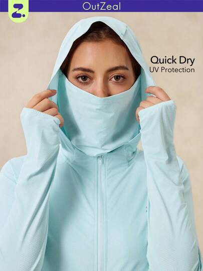 OutZeal 女士防紫外线 UPF50+ 透气抽绳腰带连帽面罩防晒夹克徒步旅行露营运动 - 淺藍色 - 查看 1