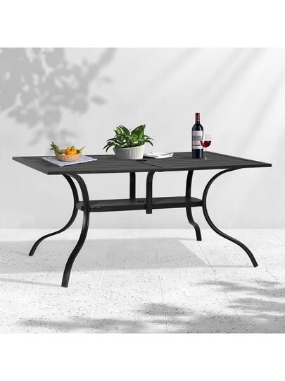 Outdoor Patio 2 Tiers Black Iron Steel Slatted Dining Table With Umbrella Hole For 6 Person - 60" X 37"