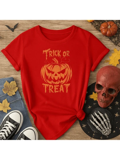 Unisex Cotton T-Shirt Printed Trick Or Treat Pumpkin 181 Short Sleeve Blouse Round Neck Women's Men's Scary Horror Halloween Theme - 紅色 - 查看 1